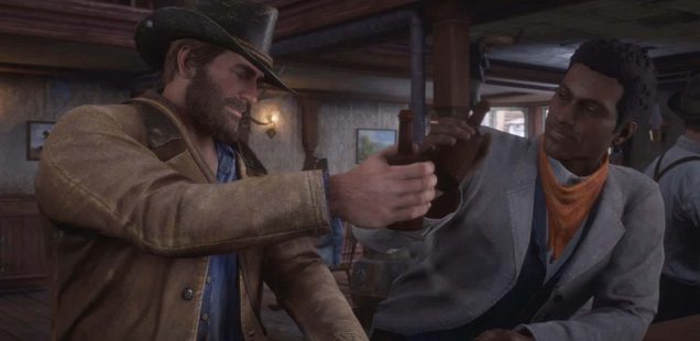 Drank: Consuming alcohol in the game has great physicality to it, far removed from the “press a button on an item screen” operation of most games. Be it beer from the bar or gin stowed in his inventory satchel, Arthur picks it up and visibly uncorks it. Once the vessel is opened, drinking itself is controlled with the right trigger. For beverages bigger than shots, Arthur must take multiple gulps. Push the button and he’ll have a sip. But if you’re you’re feeling bold and hold the button, he’ll skull the whole thing in one go, opening his gullet and sinking the lot without as much as a shudder. When it comes to alcohol consumption, choice is everything.
