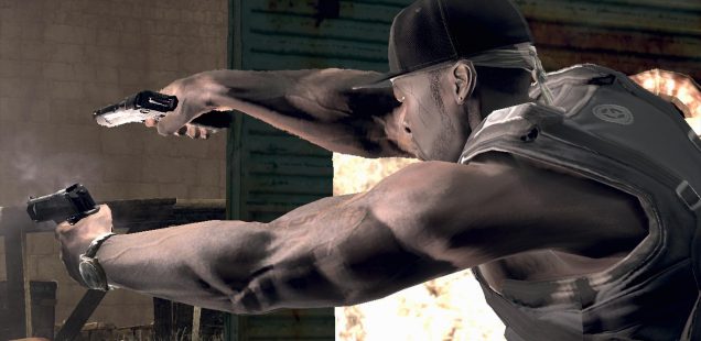 50 Cent: Blood on the Sand seeks to answer a single question: “Where’s my skull?” This is the oft-repeated line from 50 Cent, who is accompanied by G-Unit labelmates Tony Yayo, Lloyd Banks, and DJ Whoo Kid. 50 Cent is paid for a concert in the form of a diamond-encrusted skull reminiscent of the Damien Hirst pop art piece For the Love of God, though the skull is immediately snatched up by a mysterious female mercenary. Like Jimmy Carter chasing after the eponymous rifle across a ruthless desert landscape in the Western classic Winchester ’73, 50 Cent races after his glistening trophy as it changes numerous hands throughout the game, always making sure to remind players, “That bitch took my skull!” After this central conflict emerges, the earlier pretense of a recognizable civilization crumbles. The opening image of a crowded concert venue gives way to a burning warzone like a low-budget replica of the ambush in Black Hawk Down. Virtually no trace of civilians will be found, with any sense of logical storytelling replaced by a nonsense story in a nonsense setting overflowing with enemies. Blood on the Sand’s absurdities become comic: 50 Cent taunts a tank with “Fuck you!” before blowing it up with C4, clearing the path to a strip club (the only operational business in this war-torn country) set to his song “I Get Money.” The game never mocks or berates the player’s actions directly; its sheer level of comic absurdity and the joy derived from it renders players complicit with videogame violence so exaggerated that it becomes unrecognizable. Blood on the Sand resembles fictional representations of games in other media, like in Spike Lee’s film Inside Man: so cartoonishly violent as to be unreal, even as it anticipates real games like 50 Cent’s.