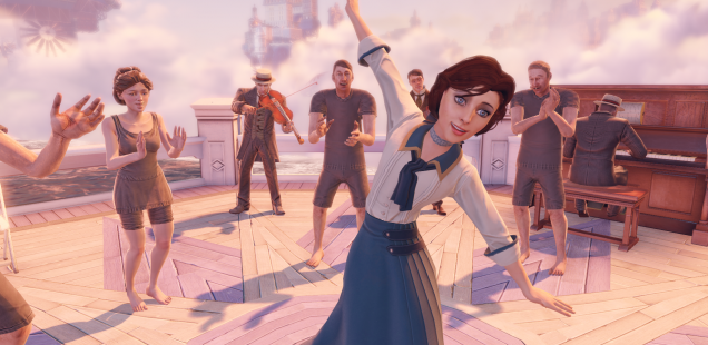 But no wonder this lavish apparent utopia provides has any effect on the game’s protagonist. The wealth of sly details to observe, conversations to overhear and cute performances to watch are acknowledged by the player, who might occupy the same physical space as our protagonist, but not the same mindset. The cantankerous Booker DeWitt remains unmoved by the concerted efforts to intrigue and entrance. I guess he’s just not that into the Beach Boys.