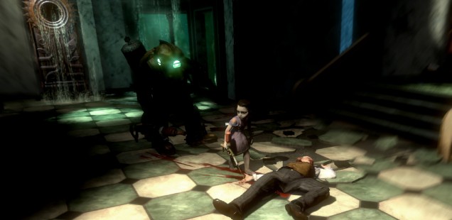 The actual gameplay of BioShock is that of the traditional first-person shooter dating all the way back to Id Software’s Doom and Return to Castle Wolfenstein. But BioShock manages to address its philosophical quandaries in its gameplay in ways those games never did. Rapture is littered with Little Sisters, children unsuccessfully experimented on now wandering the ruined city like sickly ghosts. They are protected by beings known as Big Daddies—yes, it’s beyond uncomfortable—who schlep around Rapture in large robotic diving suits armed to the teeth. Whenever you encounter a Little Sister and Big Daddy—which is quite often throughout the campaign—you’re presented with a set of ethical choices. Little Sisters possess ADAM, the Force-like magic that grants extremely powerful abilities. You could choose to ignore Little Sisters entirely, but that would leave you weakened for many of the game’s more challenging sections. The game stresses that your best course of action is to kill the Big Daddy, then either harvest or save the Little Sister. Harvest her, and you’re presented with a scene of shockingly gruesome violence in which Jack drives his fist into the child’s flesh and rips out something resembling a gooey tentacle. Save her, and the Little Sister is transformed back into a grinning child unaware that she’s trapped inside an underwater maze of terrors and ghouls.