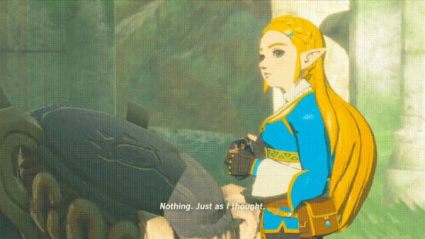 As players, we only catch brief glimpses of Zelda and her archaeological interests. More often, those scenes present character introductions for heroes of the various cultures of Hyrule as they set off to direct the Divine Beasts, constructs of gargantuan proportions and enormous environmental power. In many of those scenes, Zelda comes across as irritated with Link’s status as a destined hero, someone who carries a magical talent that enables him to grasp and wield ancient artifacts. As Zelda herself explains, the Sheikah shrines that pepper Hyrule’s landscape seem “designed to be exclusively accessed by the sword’s chosen one,” which is to say, Link. Gazing up at the sky after saying so, she continues, “But designs can always be worked around, at least I hope.”